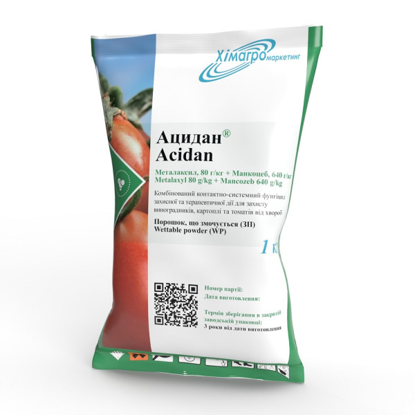 Ацидан – контактно системний фунгіцид профілактичної та терапевтичної дії для захисту винограду, картоплі, помідорів, огірків, цибулі та інших сільськогосподарських культур від збудників несправжньої борошнистої роси (мільдью на винограді), фітофторозу, пероноспорозу, альтернаріозу та інших плямистостей.