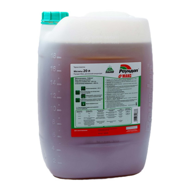 Раундап Макс – системний гербіцид суцільної дії, що проникає в бур'яни через 1 та інші зелені частини, недозрілу деревину та незарубцьовані порізи. Блокує ароматичні амінокислоти, що призводить до ураження точок росту та повного відмирання надземних і підземних органів.